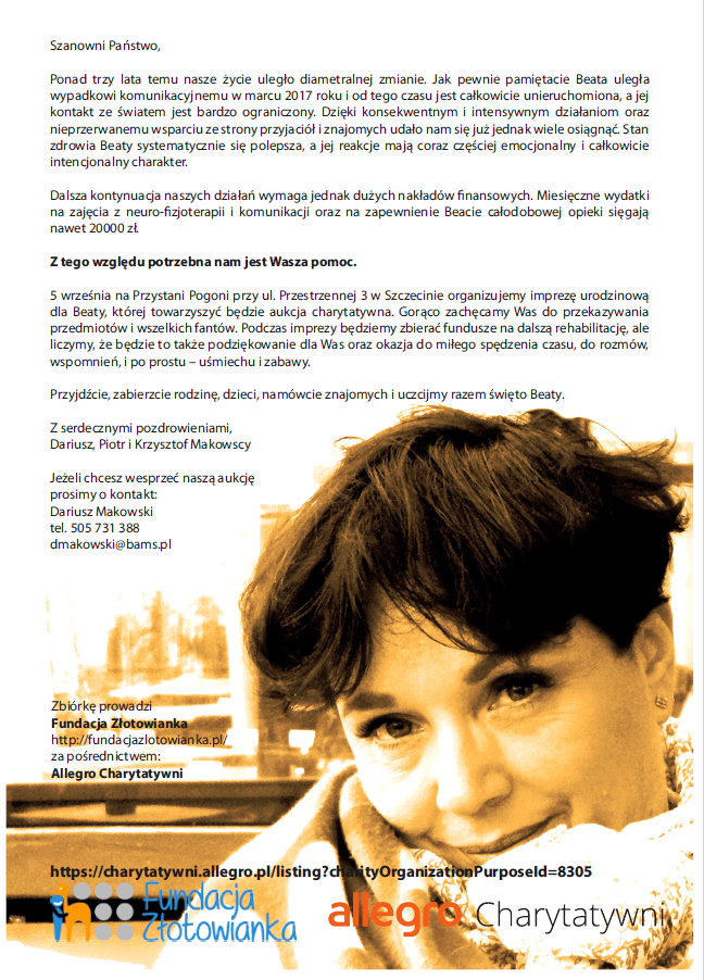 5 września na Przystani Pogoni przy ul. Przestrzennej 3 w Szczecinie organizujemy imprezę urodzinową dla Beaty, której towarzyszyć będzie aukcja charytatywna. Gorąco zachęcamy Was do przekazywania przedmiotów i wszelkich fantów. Podczas imprezy będziemy zbierać fundusze na dalszą rehabilitację, ale liczymy, że będzie to także podziękowanie dla Was oraz okazja do miłego spędzenia czasu, do rozmów, wspomnień, i po prostu – uśmiechu i zabawy.